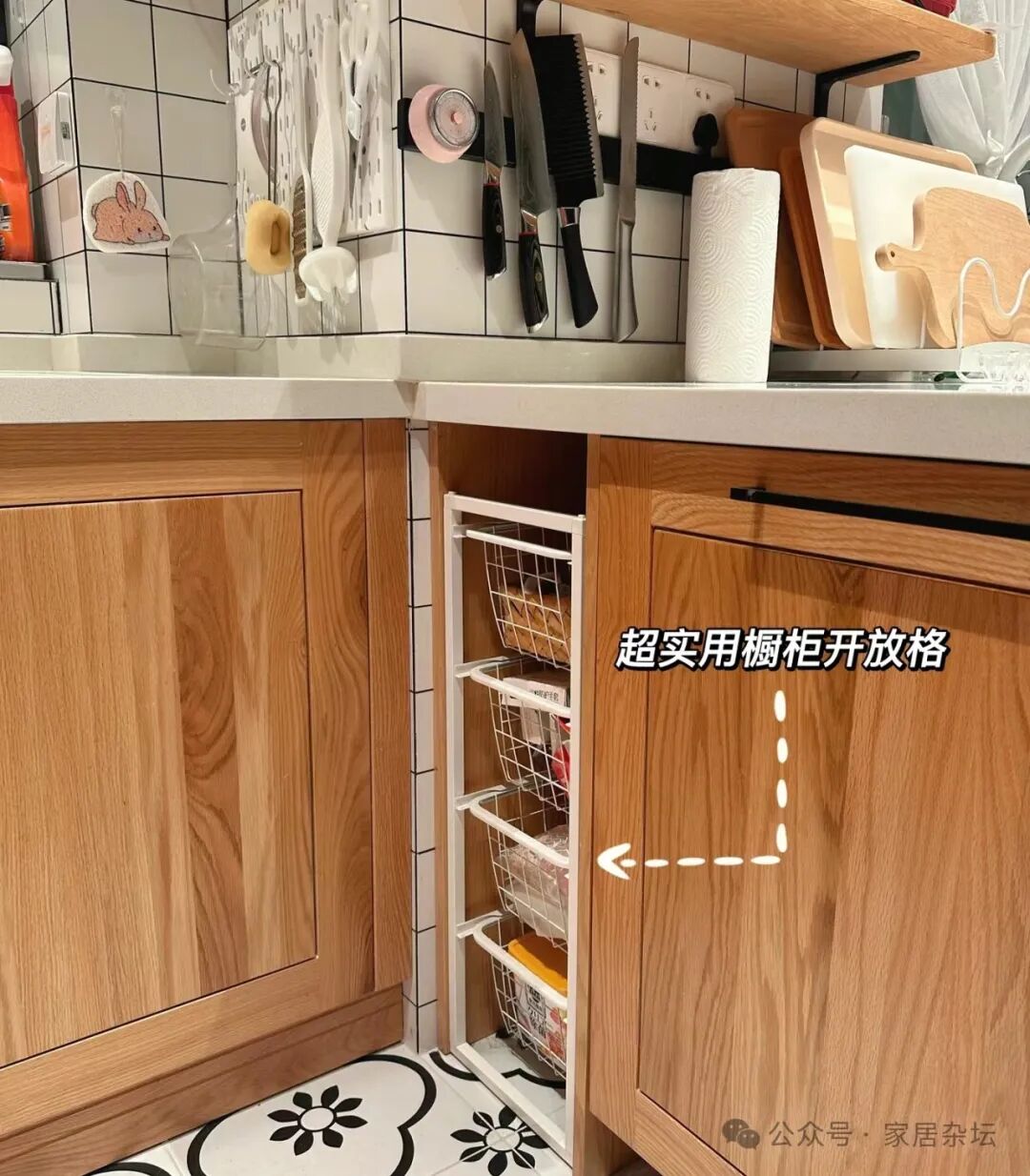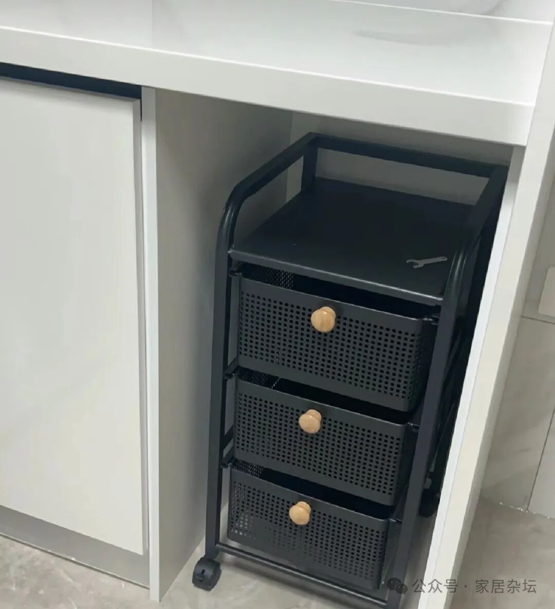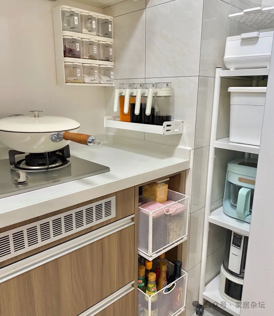 ②、实用方案。例如安装置物架,安装小推车,便宜还实用,增加厨房的实用性。