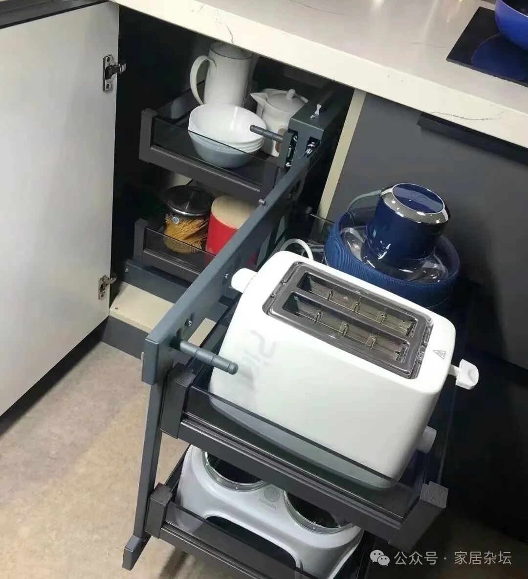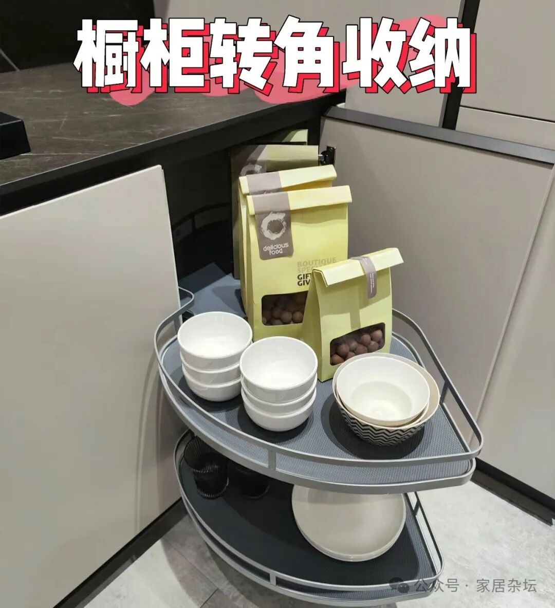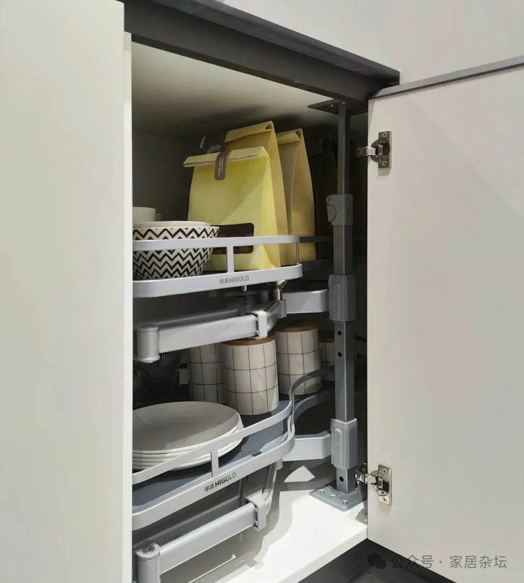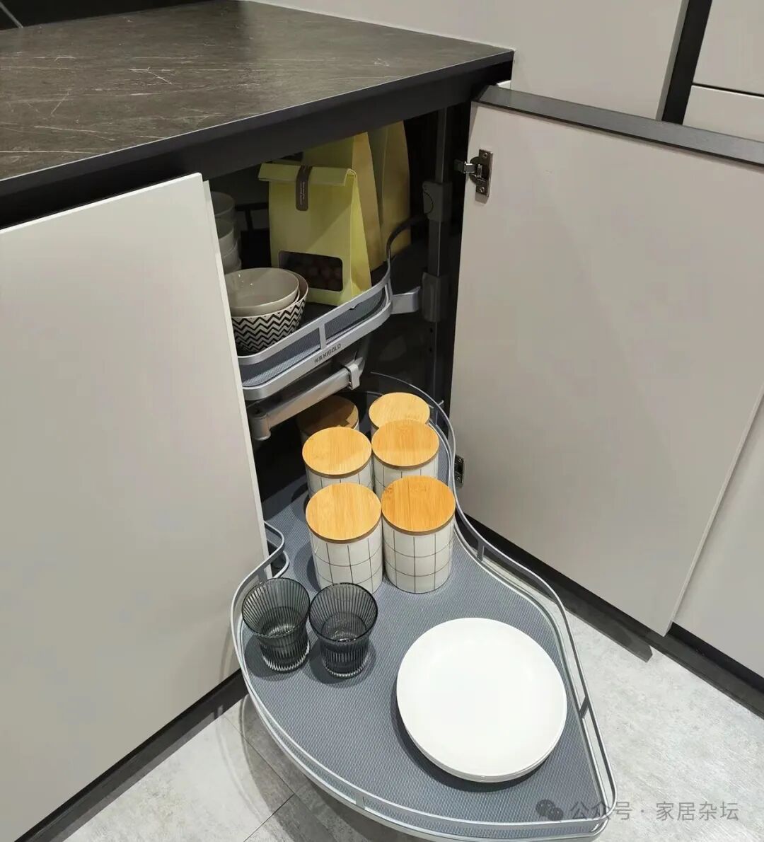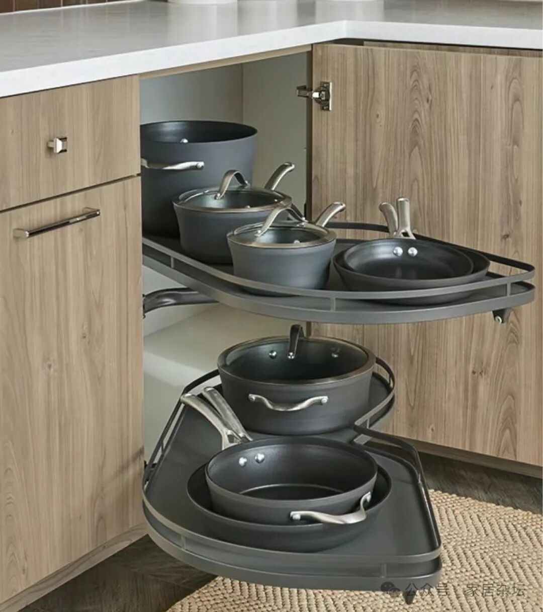 厨房转角位置的收纳,还可以采用另外一种方案,就是利用功能五金来实现。