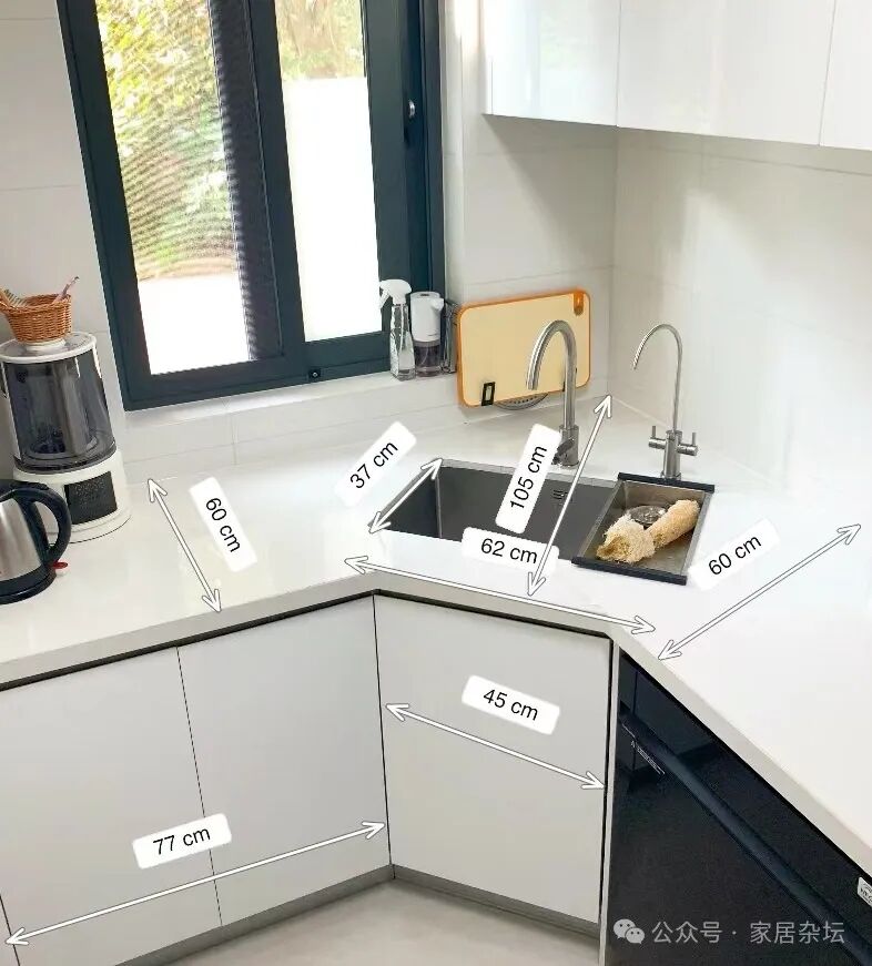 ①、尺寸把控一定要准确。要提前将橱柜的尺寸量出来,准确设计出转角抽屉的尺寸,这样才能保证这个位置抽屉合适。