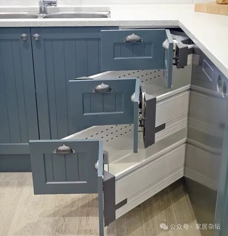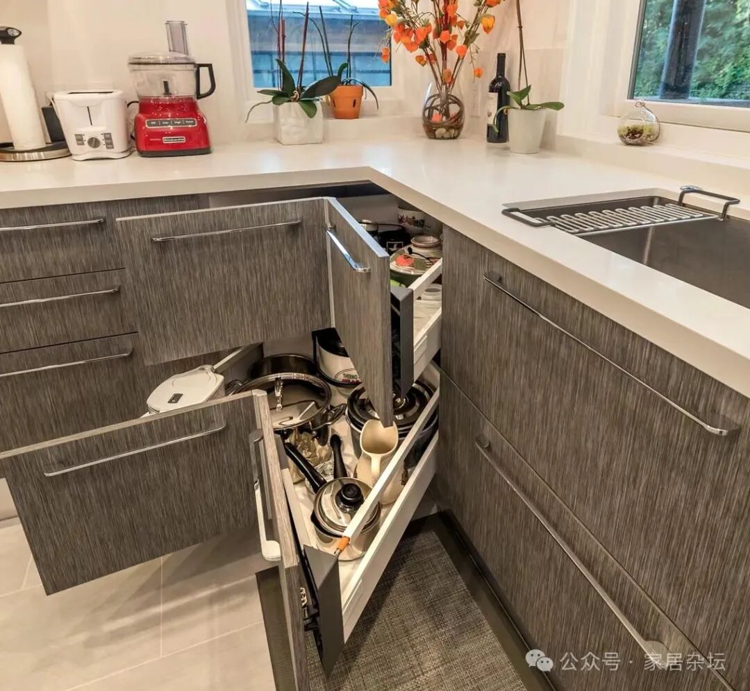 橱柜转角的位置,还有一种非常好的用设计方案,就是转角抽屉。