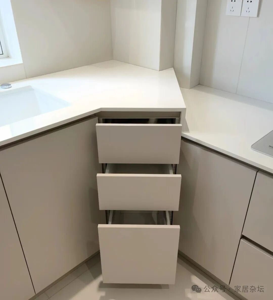 转角安装抽屉的,确实不是很多。但是这种方案设计好了,确实还是很好用的。
