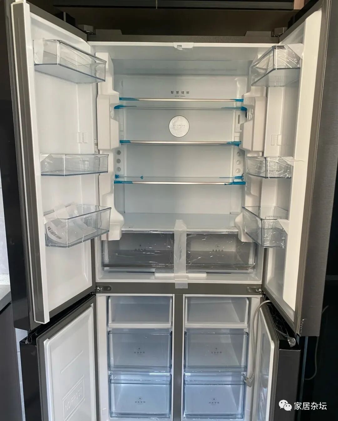 十字对开门的冰箱的上部是一体的,但是下部也是有立柱的。虽然它的容量也可以达到五六百升,但是它下部的抽屉非常小。抽屉里放的东西少得可怜,用起来也很别扭。