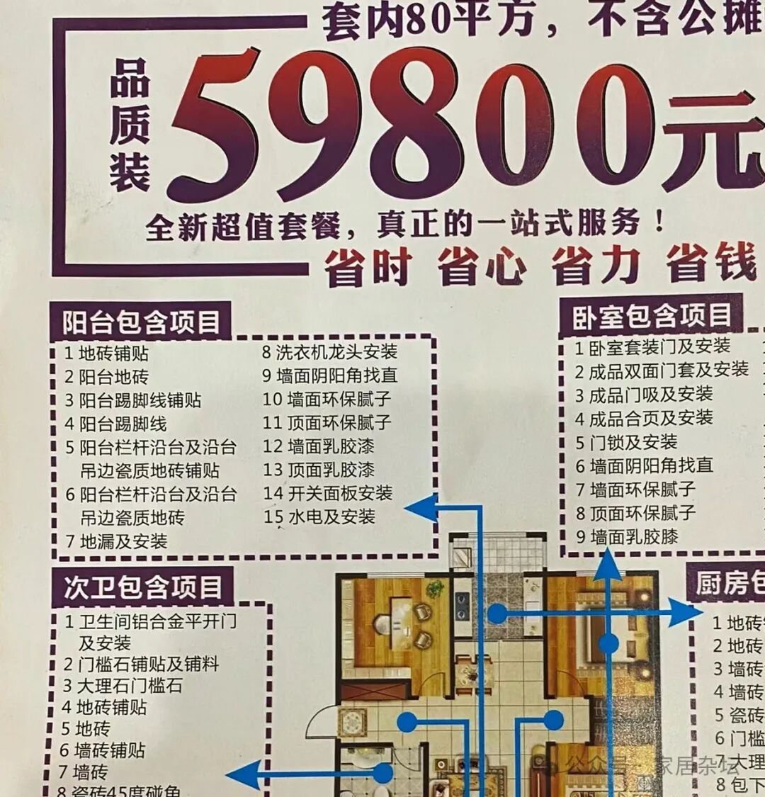 例如装修公司宣传的58800元,68800元,98800元等等,各种各样的价格,而且说是全包的价格。