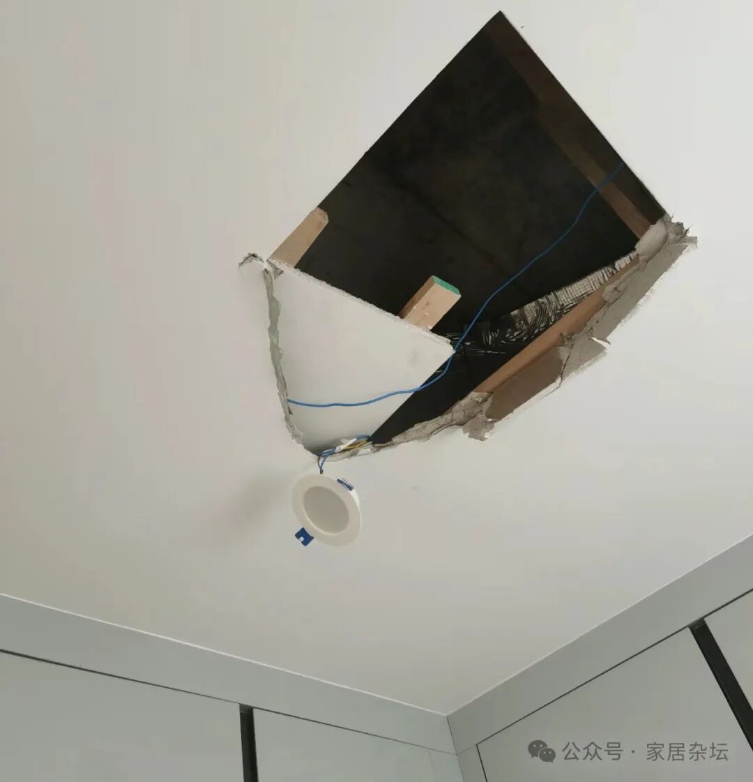 ①、顶板的漏水。其实顶板的漏水相对还好一些,拆开吊顶,就找到了漏水点。最后发现,是楼上的卫生间漏水了,最后也给修复了。