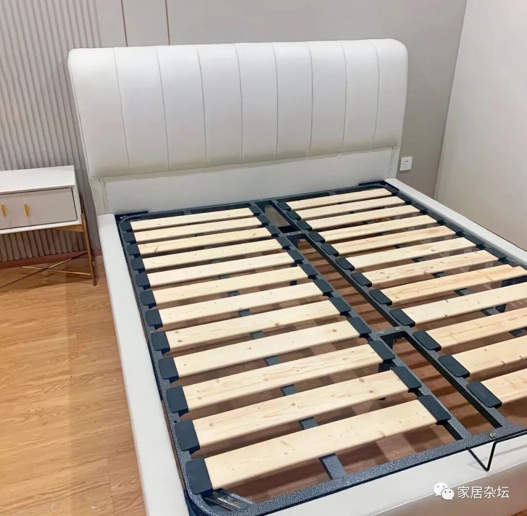 ①、首先建议大家选择的床体结构,就是目前比较流行的排骨架床。排骨架床周侧有木质,也有金属结构的,但是上面都是排骨架的。