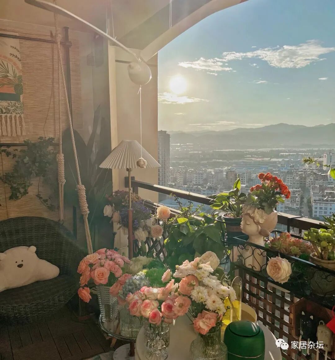 ①、养花养草乐趣多。因为是敞开式的阳台,我们可以在阳种各样的植物花卉,让阳台充满自然的气息。