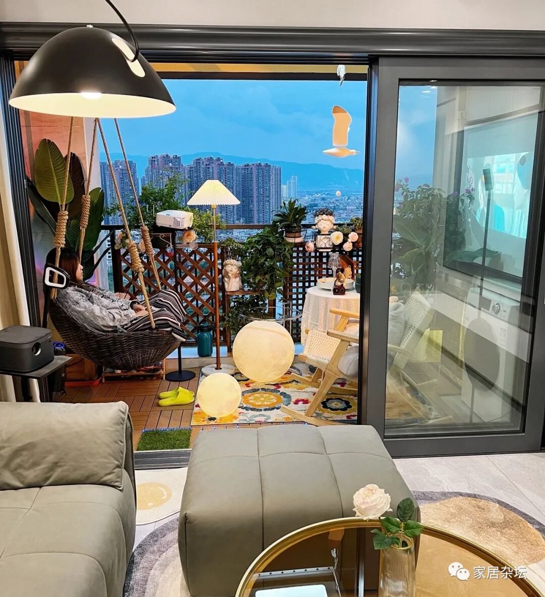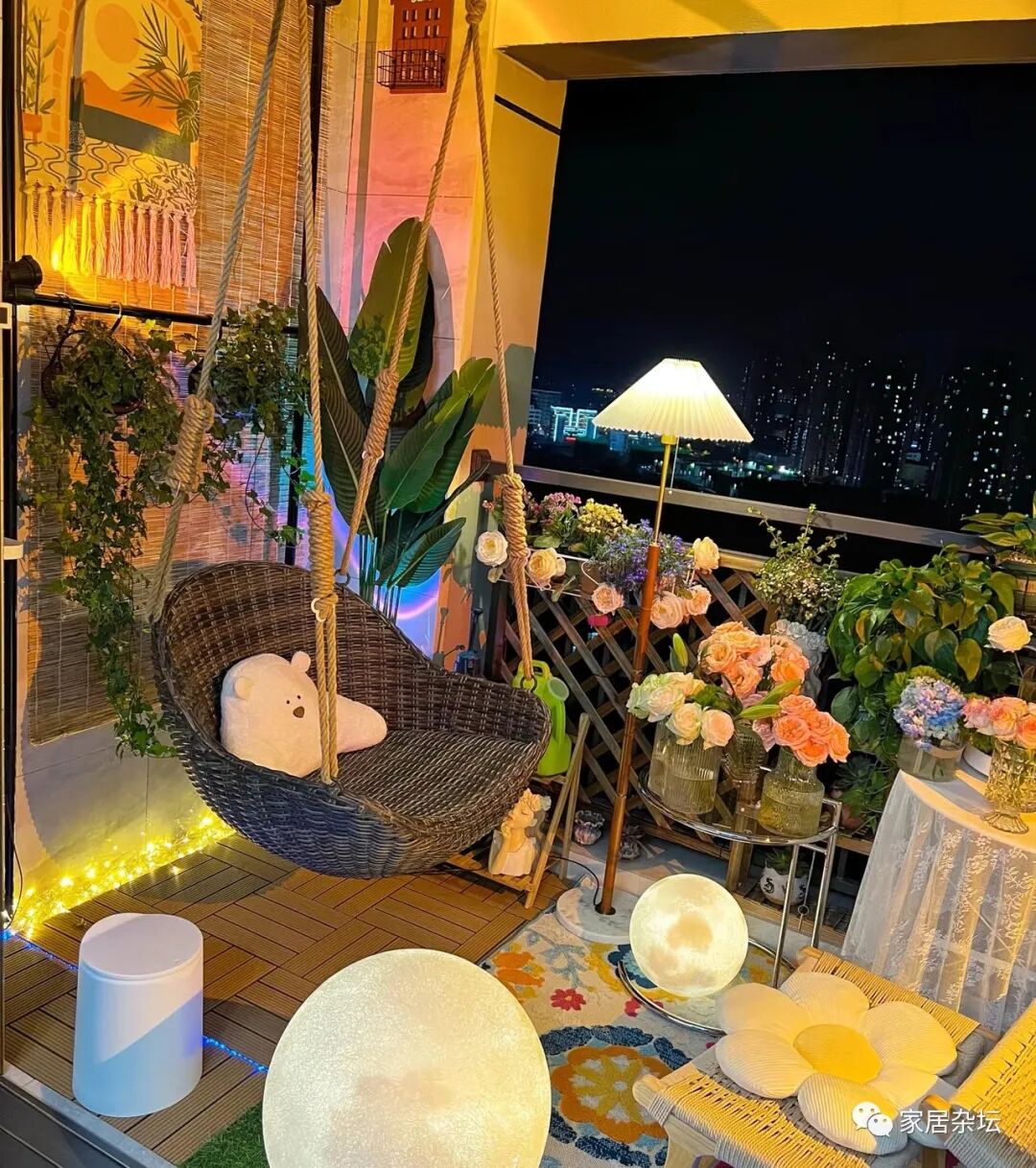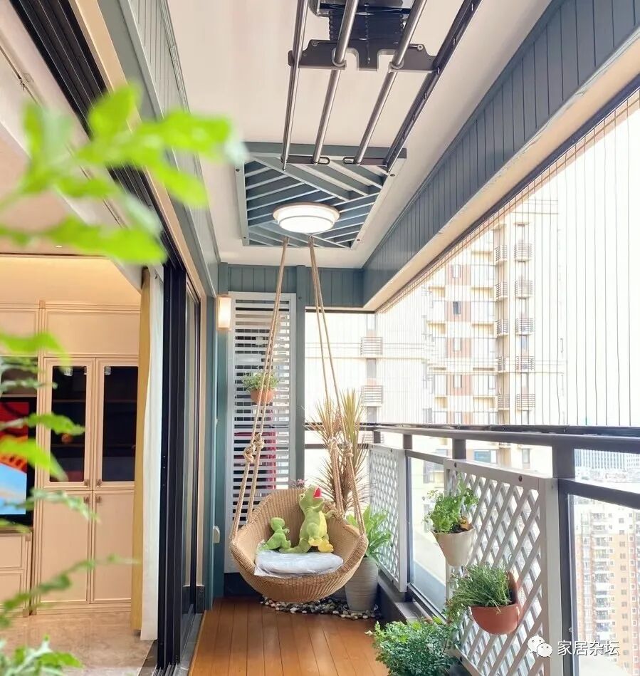 ②、阳台上的生活乐趣也比较多。例如可以安装一个秋千或者是吊篮,躺在上面晒太阳。或者摆放茶具喝茶,各种各样的生活乐趣,都可以体验到。