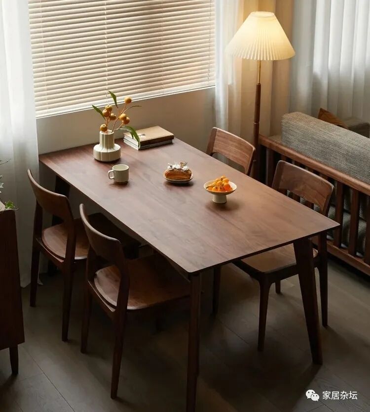 ②、对于客厅的餐桌,尽量选择轻便的。不建议选择尺寸特别大的,还有那种可以旋转的,建议就选择简单的实木餐桌。