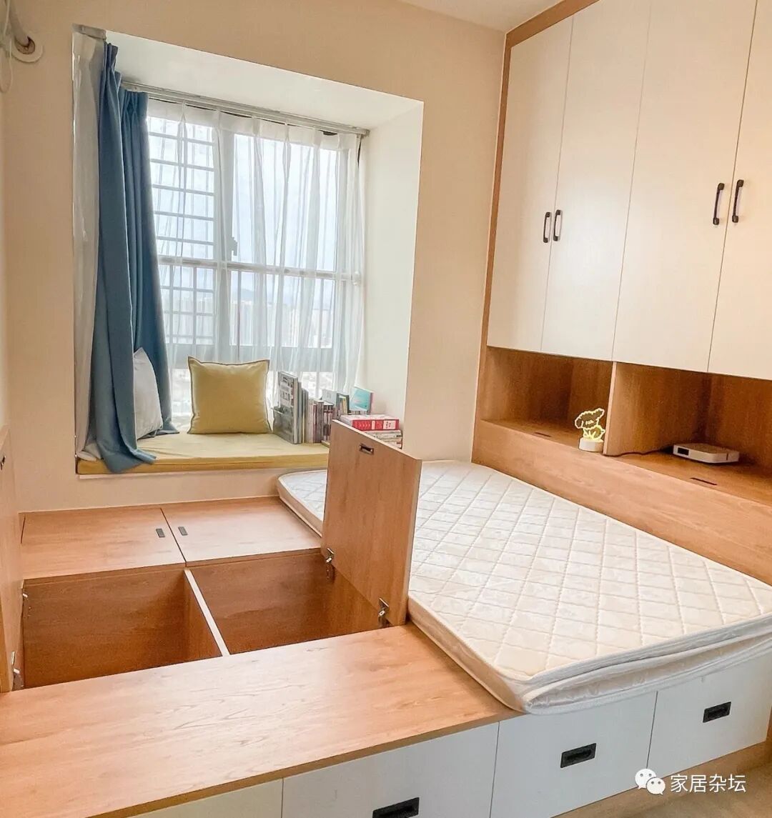 ①、如果卧室尺寸小,那么建议大家可以在墙上多做一些柜子。买床就买普通的床,这样可以增加收纳空间,住起来也更舒服。