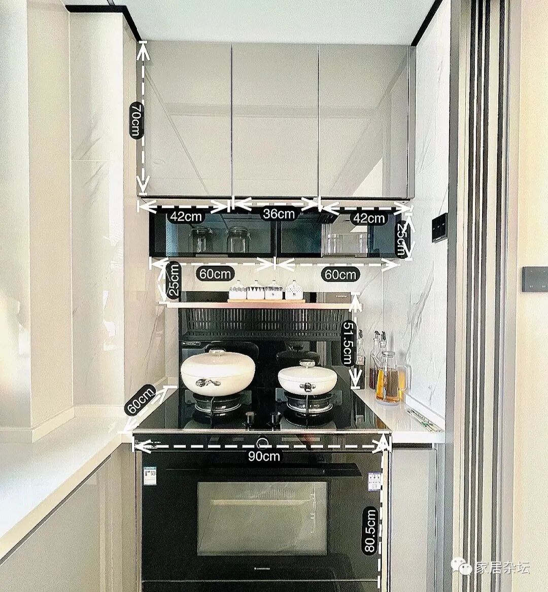 小厨房中,我们还要注意一点,就是灶具后面墙面空间的尺寸。我们要提前测量,看是否满足安装油烟机。