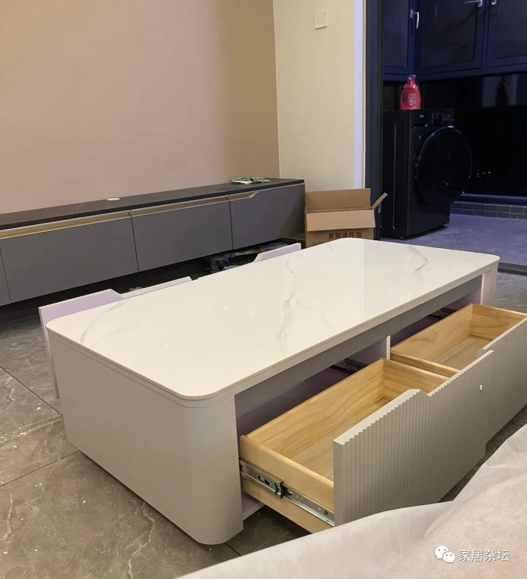 比较传统的茶几可能是实木茶几,然后又出来了玻璃面的茶几,以及最近比较火的就是岩板茶几。
