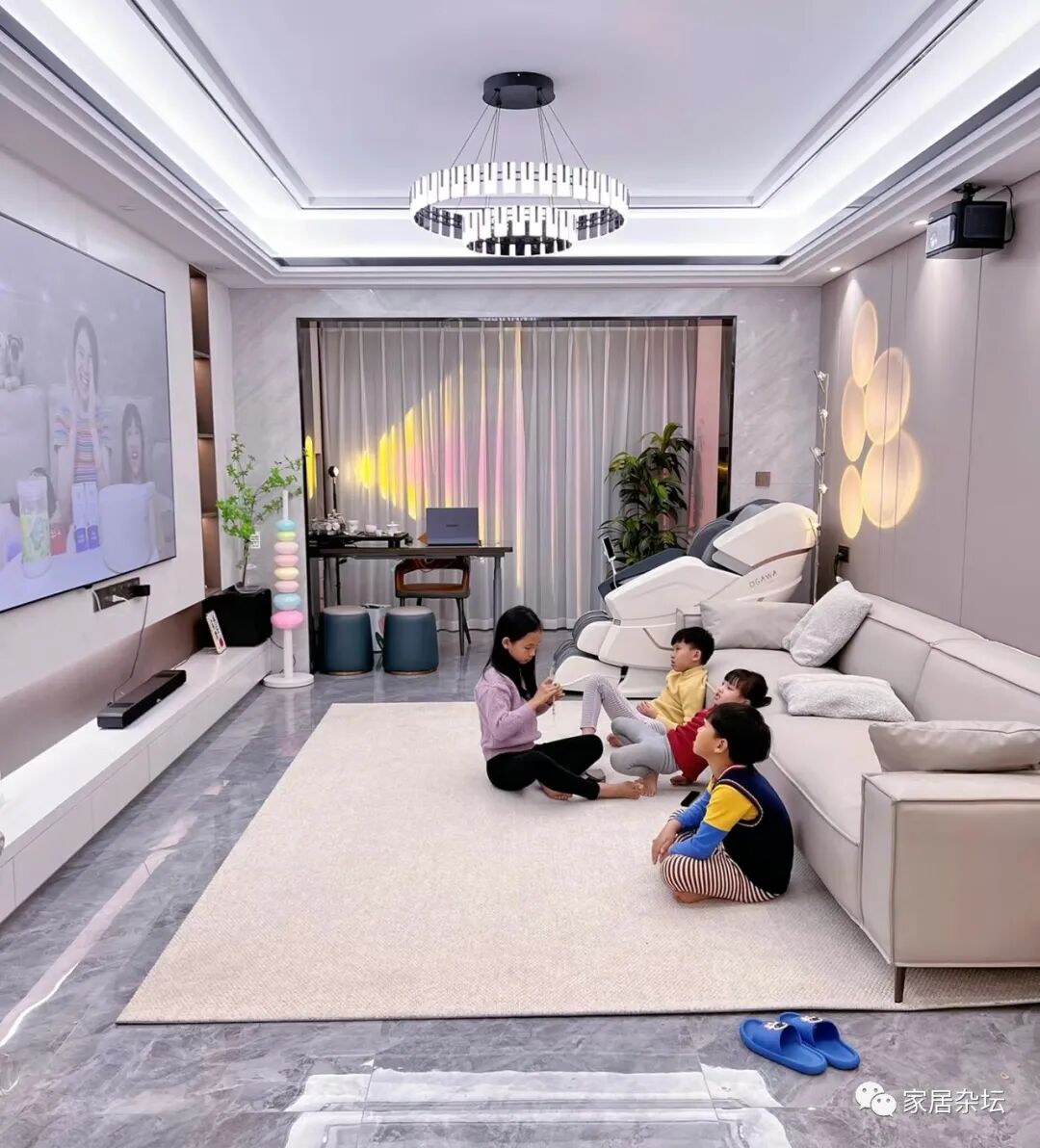 ③、功能设置。对于去客厅化,个人建议大家把功能设置成读书、娱乐的休闲区域。平时小孩子可以在上面玩耍,大人可以看书,做操,做瑜伽等等。