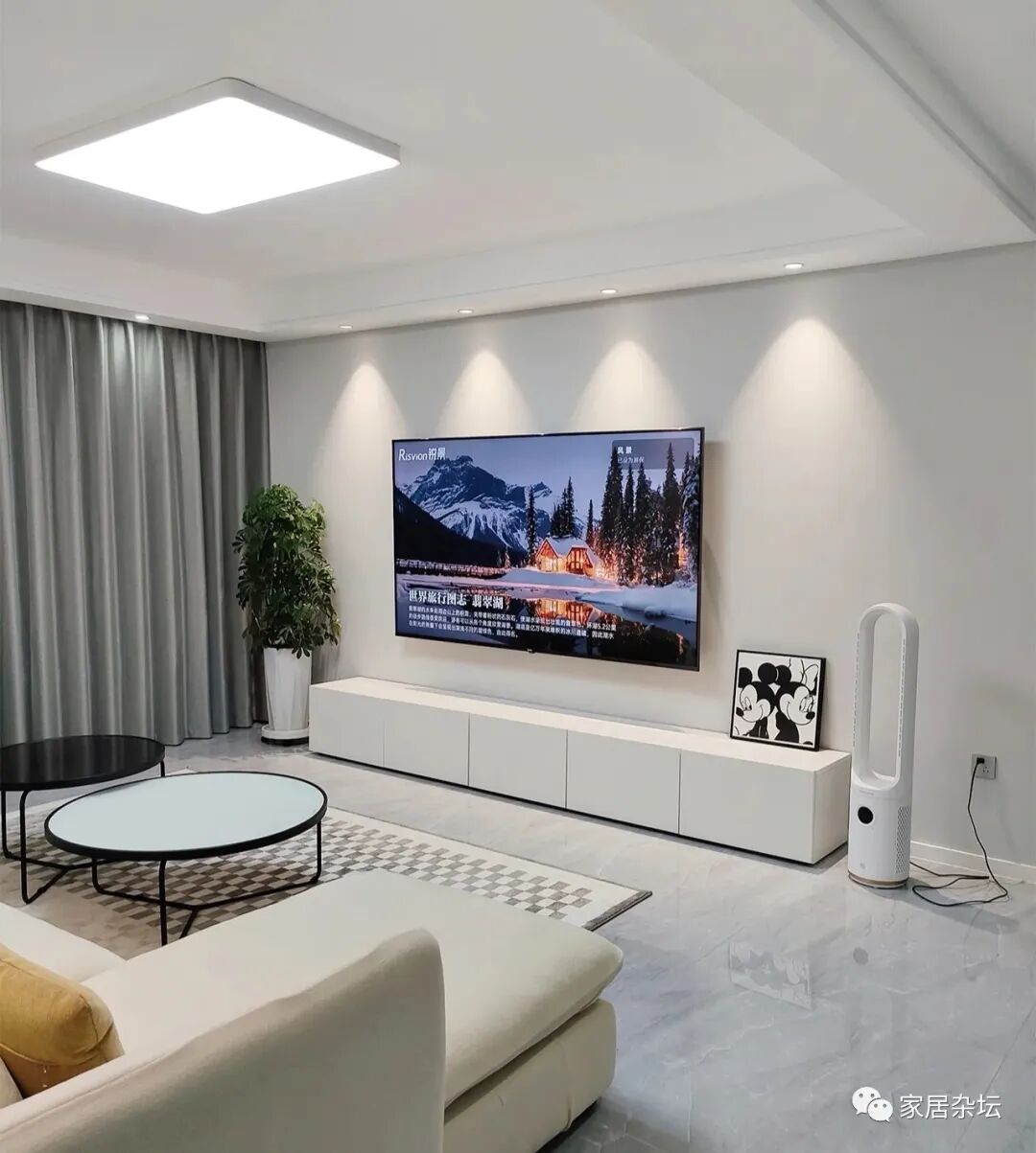 ①、对于电视背景墙,建议大家采取传统的平面电视背景墙。也就说墙面尽量不做任何造型装饰,客厅的墙面做电视背景墙就可以。