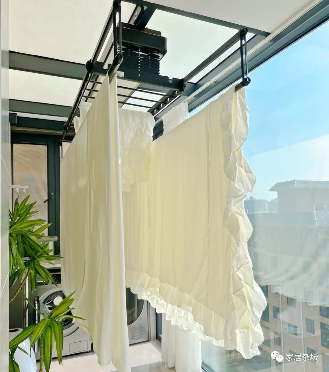①、对于晾衣架,个人建议大家选择带有电动升降功能的晾衣架。按遥控器,可上可下就可以了。