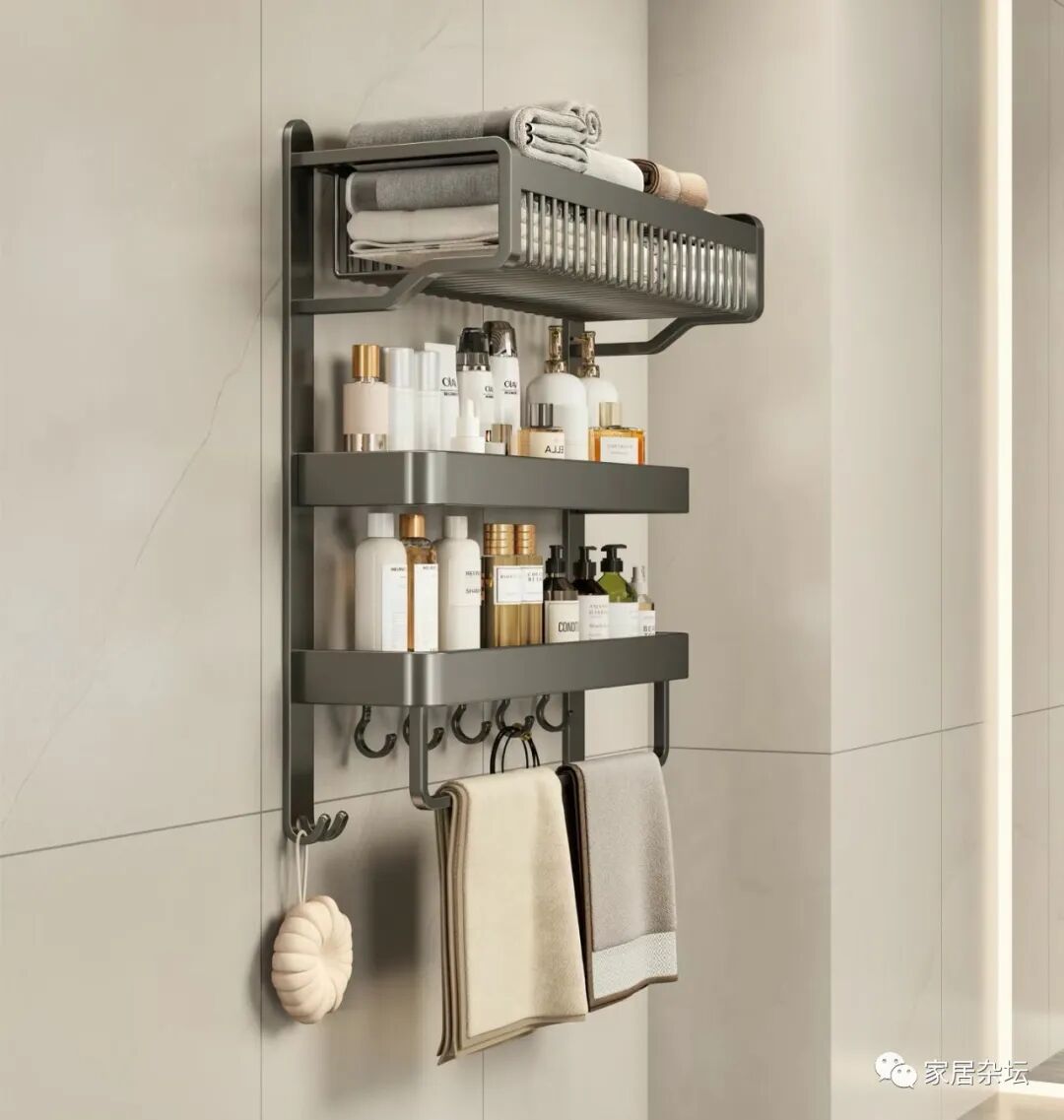 ②、对于小卫生间,建议大家多使用置物架。比如在墙面,在各个角落,都可以安装置物架,你会发现,用处真的很大。