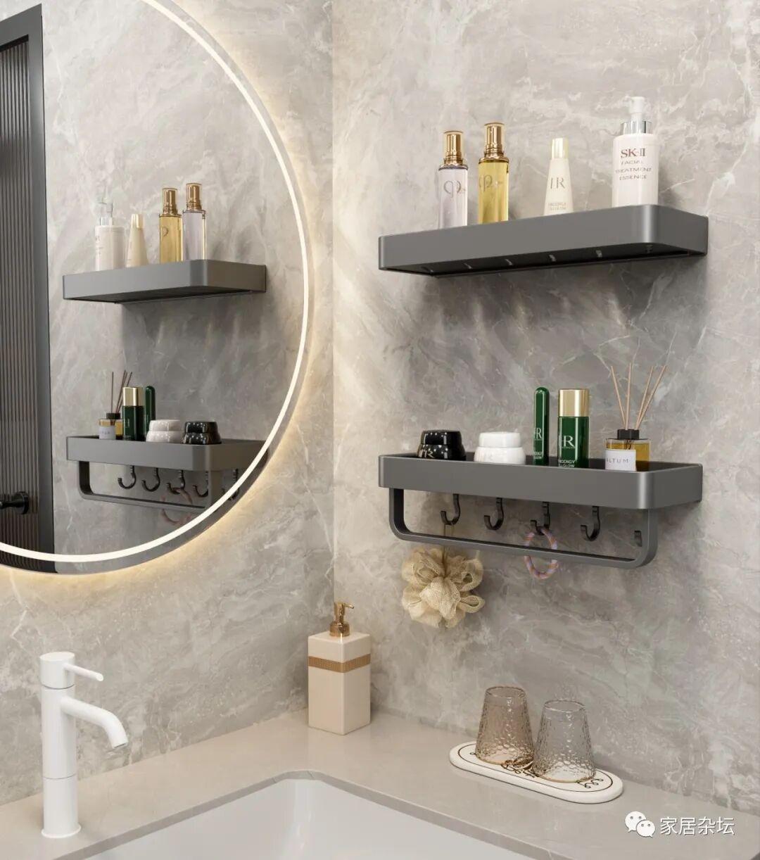 ②、置物架比壁龛更实用。像我们购买2层,3层的支物架,安装在墙面上,你会发现几乎可以把卫生间的东西都收进去了,非常的实用。
