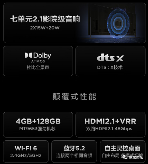 ③、音质好。好的音质,是我们观影体验的一个非常重要的方面。采用了七单元2.1影院级音响、杜比全景声、DTSX技术,实现了全新的音质体验。