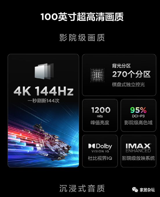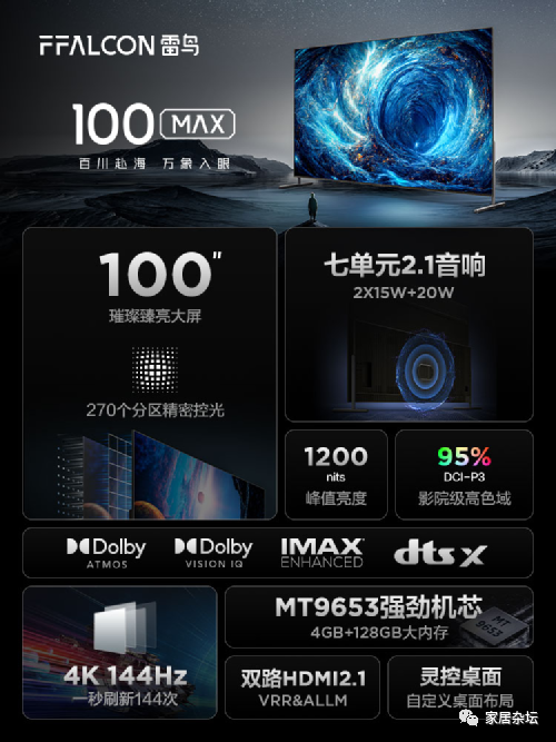 ②、性能强。在看完颜值以后,大都会看电视的配置。雷鸟100MAX拥有100英寸璀璨臻亮大屏,再加上4K144HZ+MEMC运动补偿,270个分区,超流畅的画面表现力。谁不喜欢呢?
