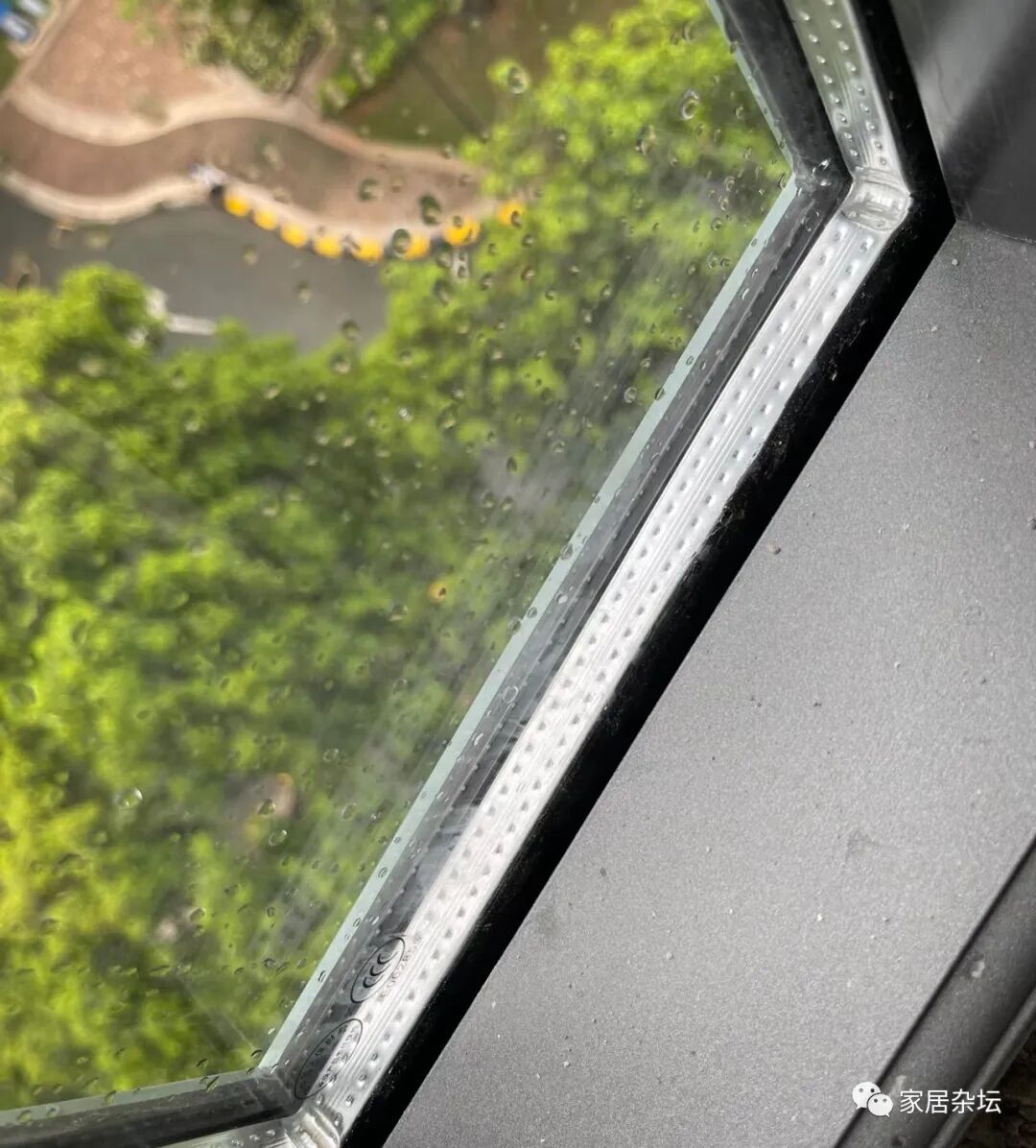 ③、窗框漏水。这就是典型的型材漏水,在下雨以后就发现,顺着窗框型材向下流水。
