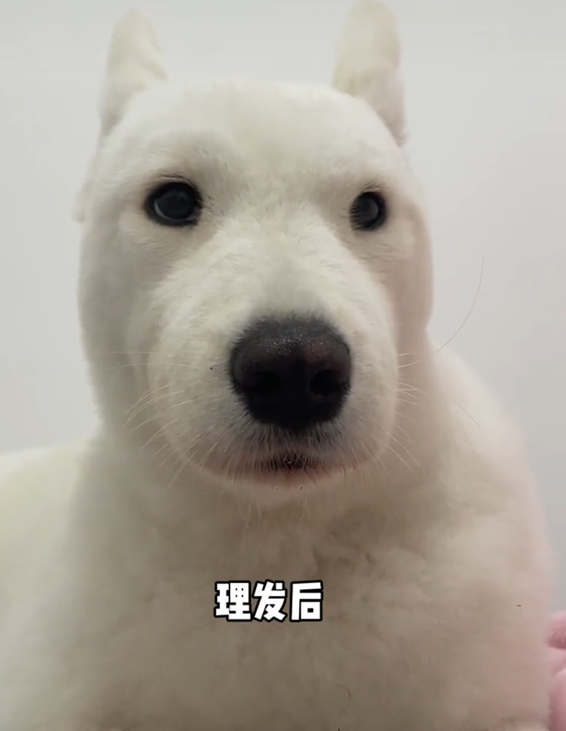 理发后:萨摩耶怎么不笑了呢,是天生不爱笑吗?不知道它是不满意这发型,还是要配合这个发型让自己变得高冷些。