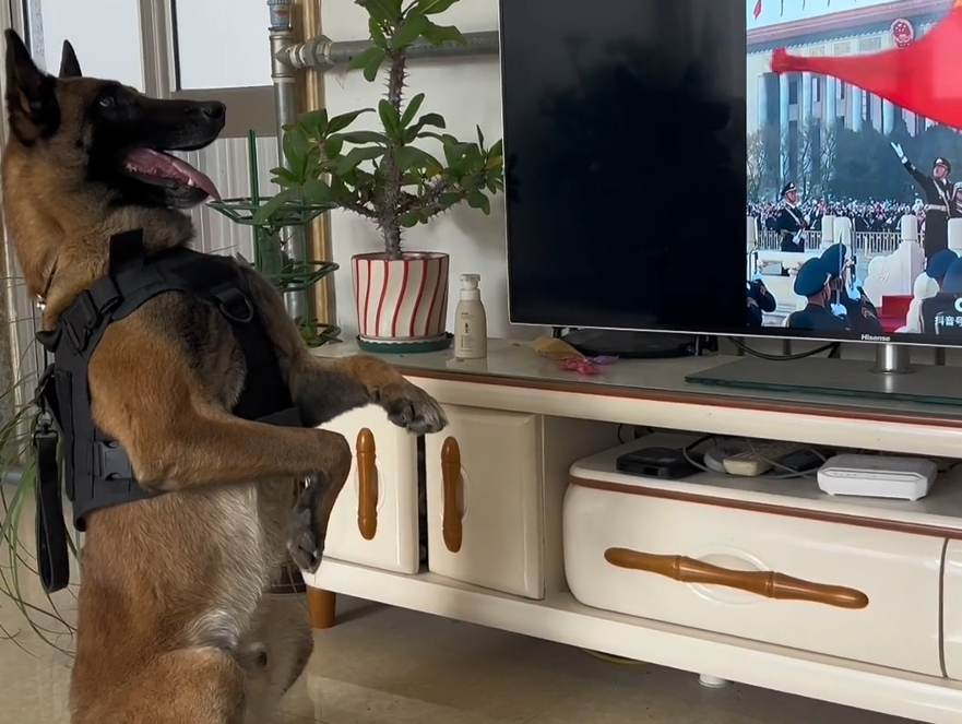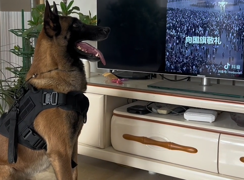 家里那只退役警犬看到后,立马跑过去,原地端正的坐好,当升国旗开始缓缓升起来时,它立马做好站立的姿势。