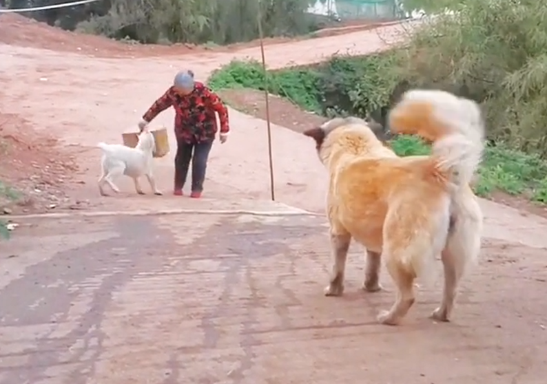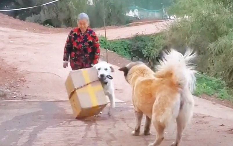 老人出去买东西,回来时提着个大纸箱子,两只狗看到后,大白立马冲过去,用嘴就叼住奶奶手中的纸箱,转身就跑。