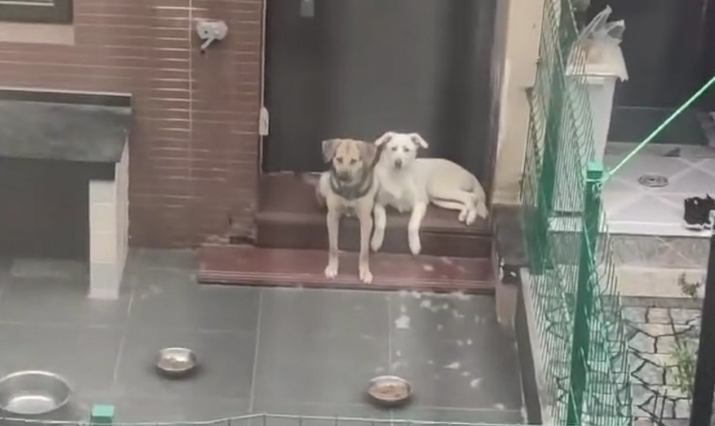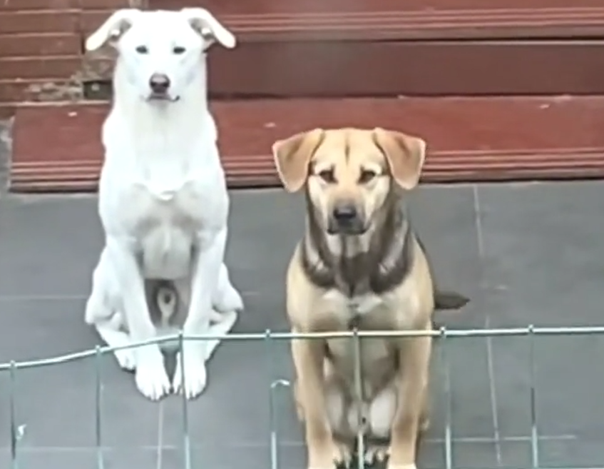 经过男子反复的对狗子训练,只见灰狗在台阶上,白狗在院子里,两只狗子坐得一个比一个端正。