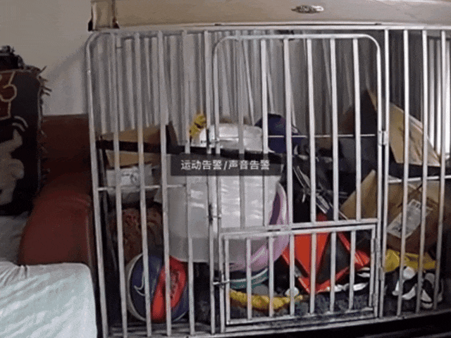 没想到,狗子只是原地转一圈,然后刚一趴下,笼子就塌了,原本放在上面的杂物,一下全部掉到狗笼里。