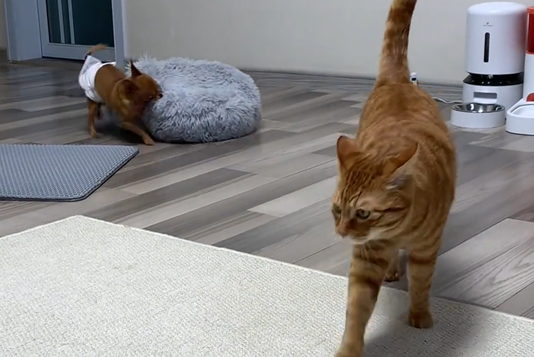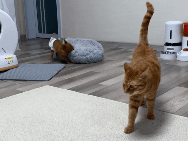 猫咪看到一点没剩的猫粮,立马就跑去找狗子对峙。