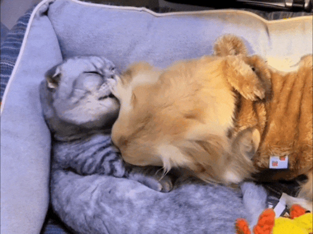 猫咪好像也知道狗子困了一样,就任由狗子在怀里撒娇,还会非常贴心的给小狗舔毛,哄他睡觉。