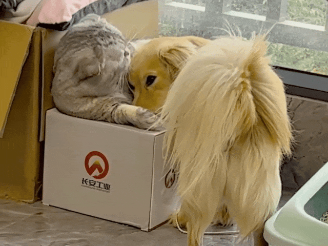 这个狗小弟不是简单的跟随,而是负责负责帮橘猫大佬挪窝。