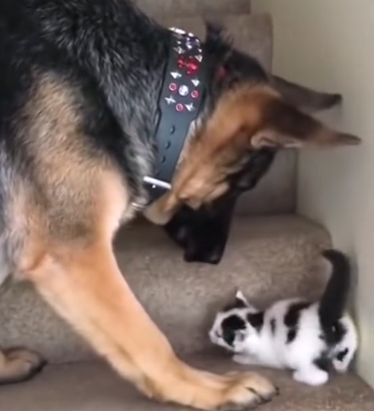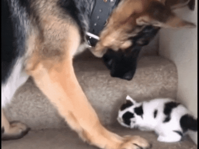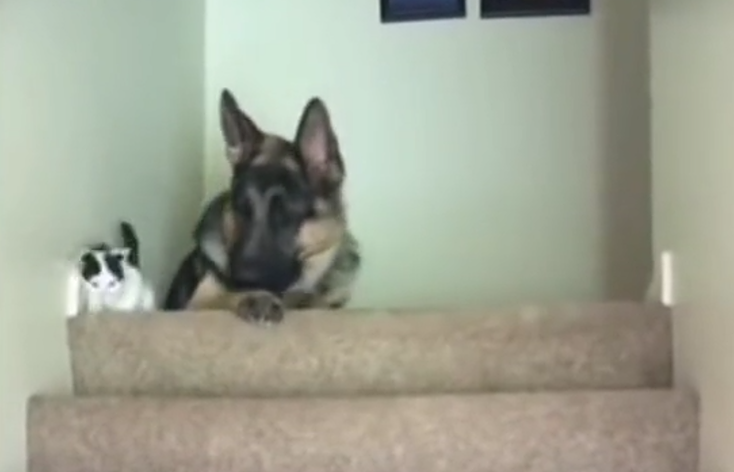 德牧:我可真棒,帮助小猫咪上楼,今天又是养猫开心的一天。