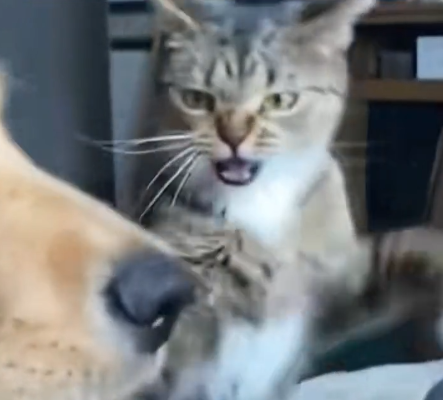 猫咪一看,狗子连续两次都抢走了主人原本给自己的食物,立马就生气了,上去对着狗子的脸就是邦邦几拳。