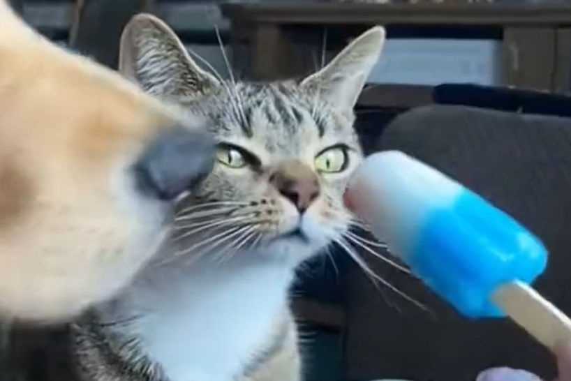 主人在家吃冰棍,想给猫咪闻一闻,看它吃不吃。