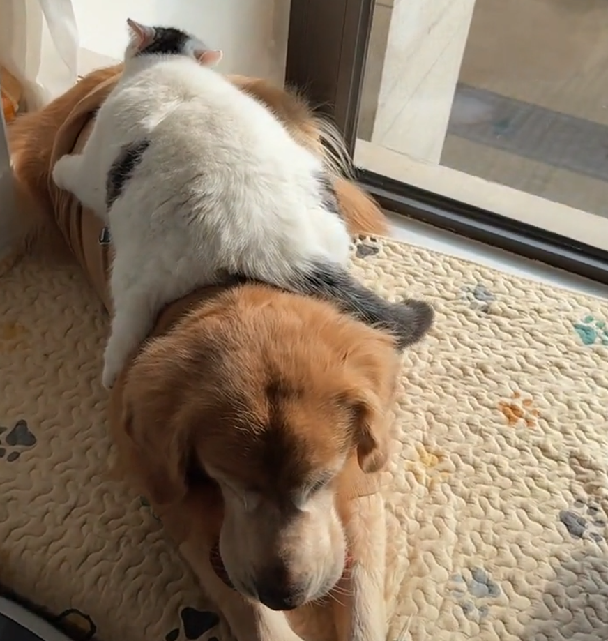 还有些小猫咪会把狗子毛茸茸的后背当成窝,想睡觉时就趴在上面,狗子也任由猫咪这样做,一动不动的趴在那。