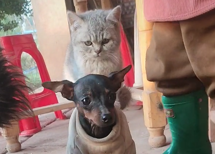 铲屎官把猫咪带回老家,老家的狗和猫打架没打过,心中又非常气不过。