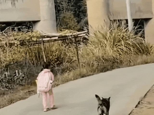 大黄看到小主人背上书包后,就会立马起身跟在后面,一路把孩子护送到学校。