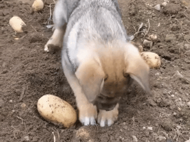 家里人忙着挖土豆时,大黄也会学着家人的样子,用力的在地下刨。