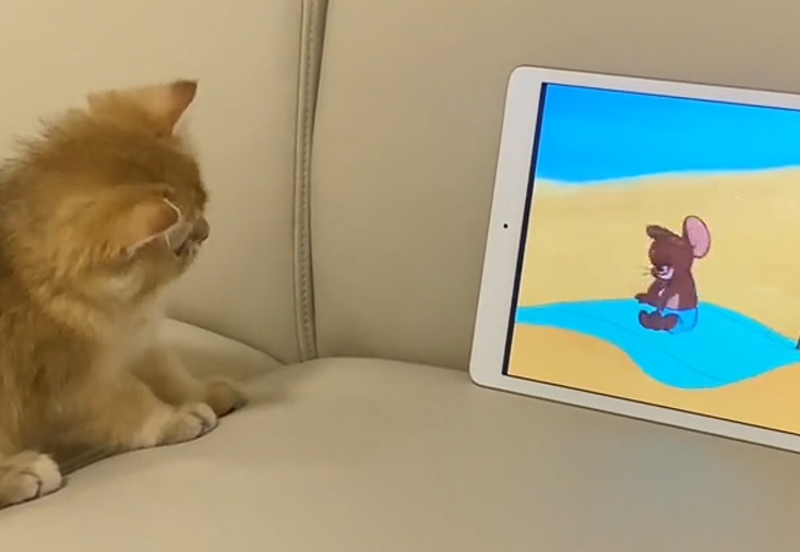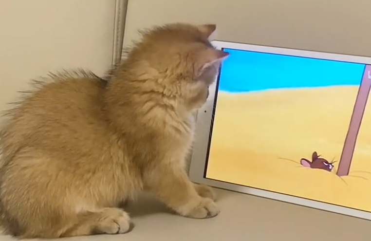 刚开始,小猫咪看动画片,就乖乖趴在那里,眼睛盯着屏幕看,偶尔动画片里面出现了感兴趣的内容,它会上手抓几下。