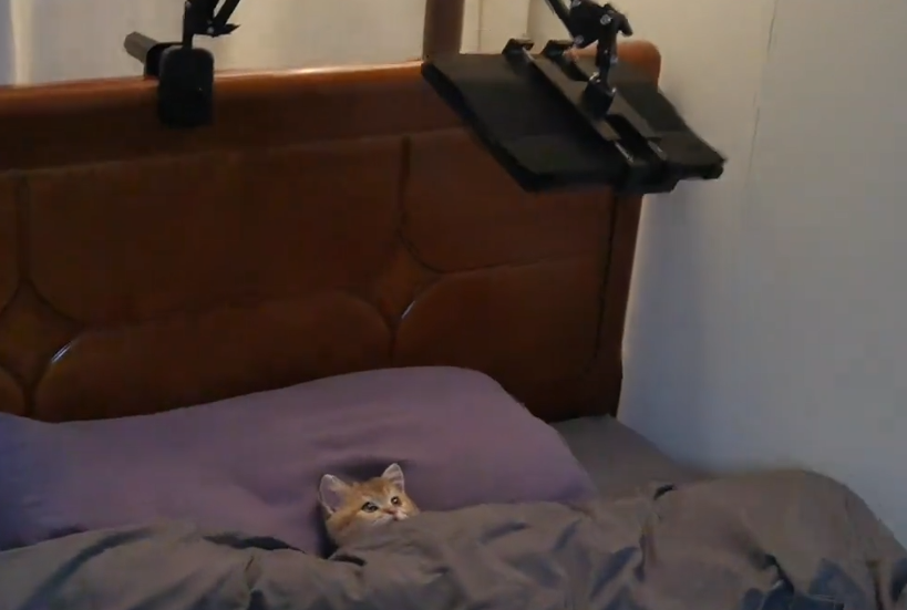 等她吃完饭要回去继续追剧时,只见小猫咪直挺挺的躺在床上,正盯着手机看呢。