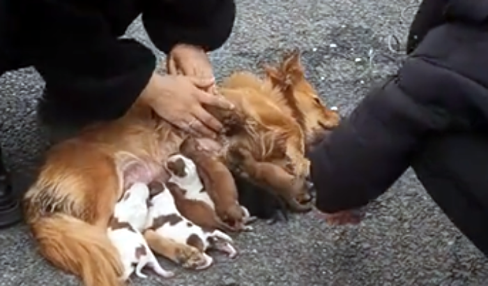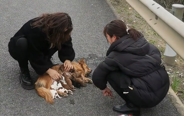 铲屎官一看,车里一个大狗,再加上几个小狗崽,空气也流通也不好,索性就把大狗和小狗全都搬下车,放在路上,车上的人下来看着狗子和狗崽。