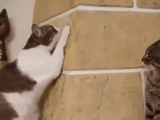 白橘和狸花在墙的转角处,狸花在认 真的给自己舔毛,此时的白橘突然手欠,就想伸长胳膊去摸一摸狸花。