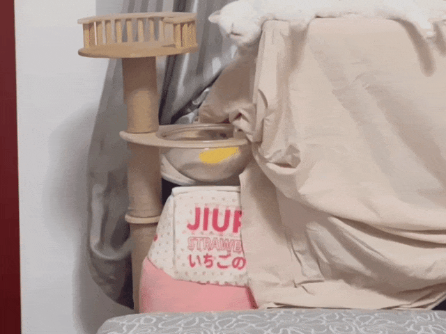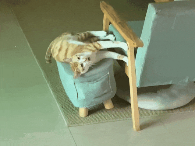 小白在猫爬架旁边的垫子上睡觉,梦到自己在追捕猎物,四条腿不受控制的开始胡乱蹬。