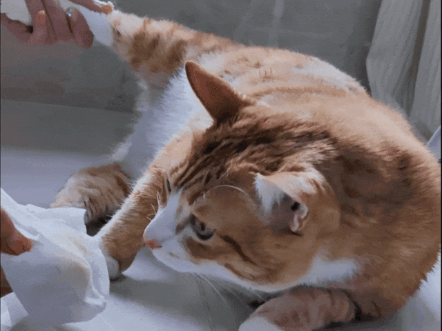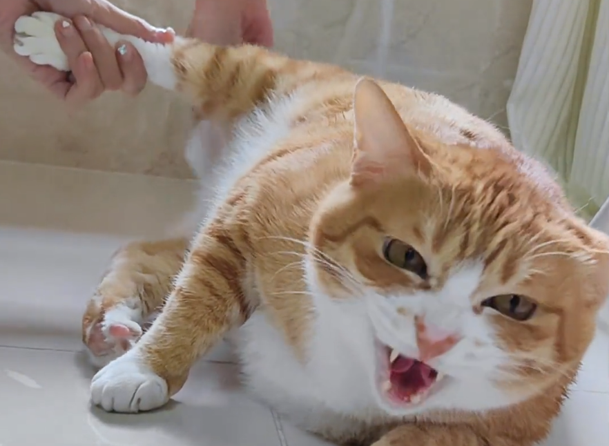 大橘刚上完厕所,主人拿纸在给它擦屁股,它非常不耐烦,嘴里一直骂骂咧咧:不就是上个厕所嘛,也不脏,为啥要一直不停的擦。