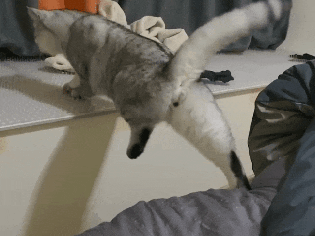 小银子看到主人在床上躺着,它就准备跳上床上玩一会,但因为用力过猛,屁股过大,加上惯性的作用。