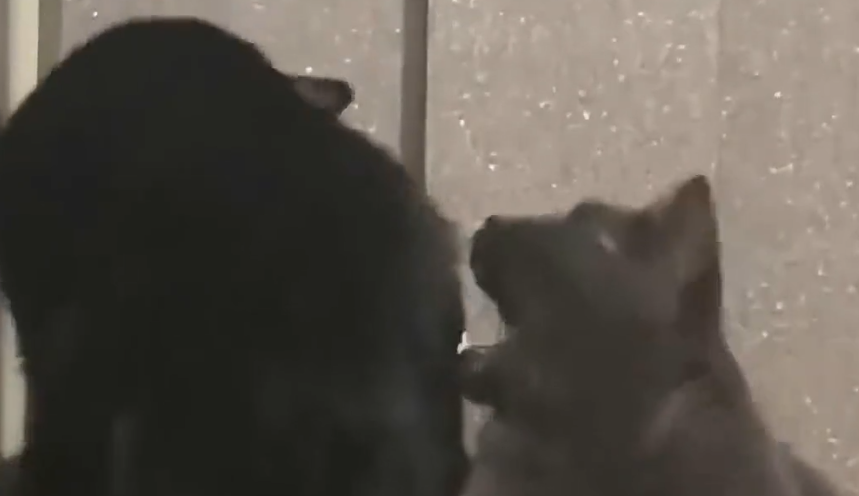 小黑背对着小蓝,在认真的舔毛,旁边的小蓝不知道突然想起俩人之间的哪次仇恨。