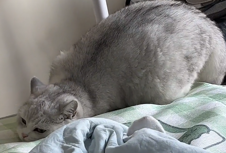 小银子跳上床的瞬间,屁股一下撅上天,为了不让主人发现它的尴尬,顺势就用脸来个滑铲,直接趴在床上,一动不动,好像最初就想用这种姿势趴在床上一样。