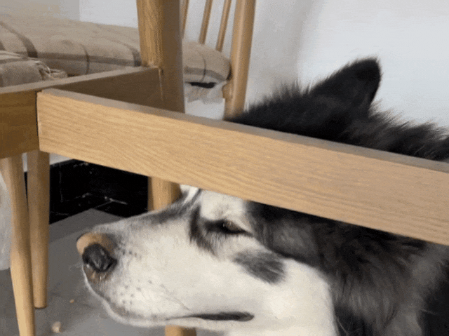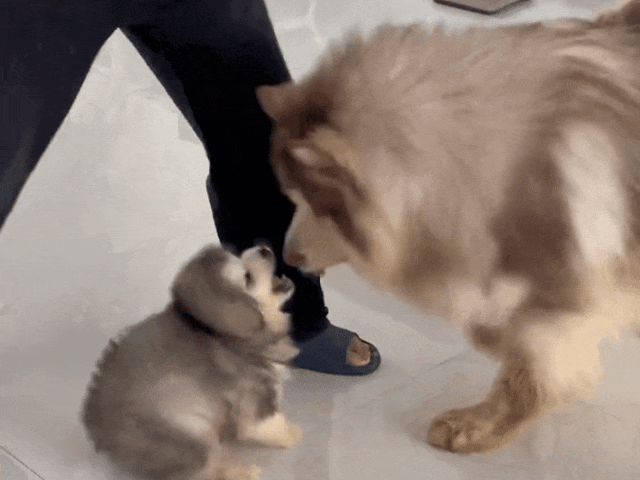 而此时的大狗还没碰到小狗,原来阿拉斯加的戏精体质是天生的,而且从小就开始了。