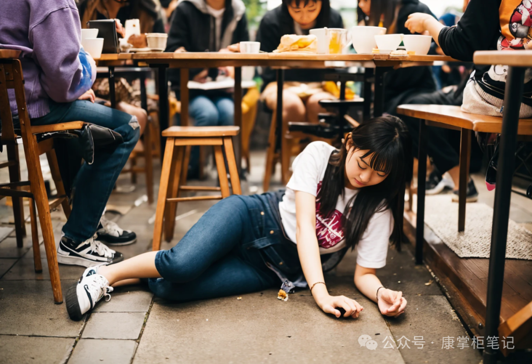 但她没有注意到地面洒了少许豆浆,应该是别的客户不小心弄到地上的,结果一脚踩上去就直接滑倒了。