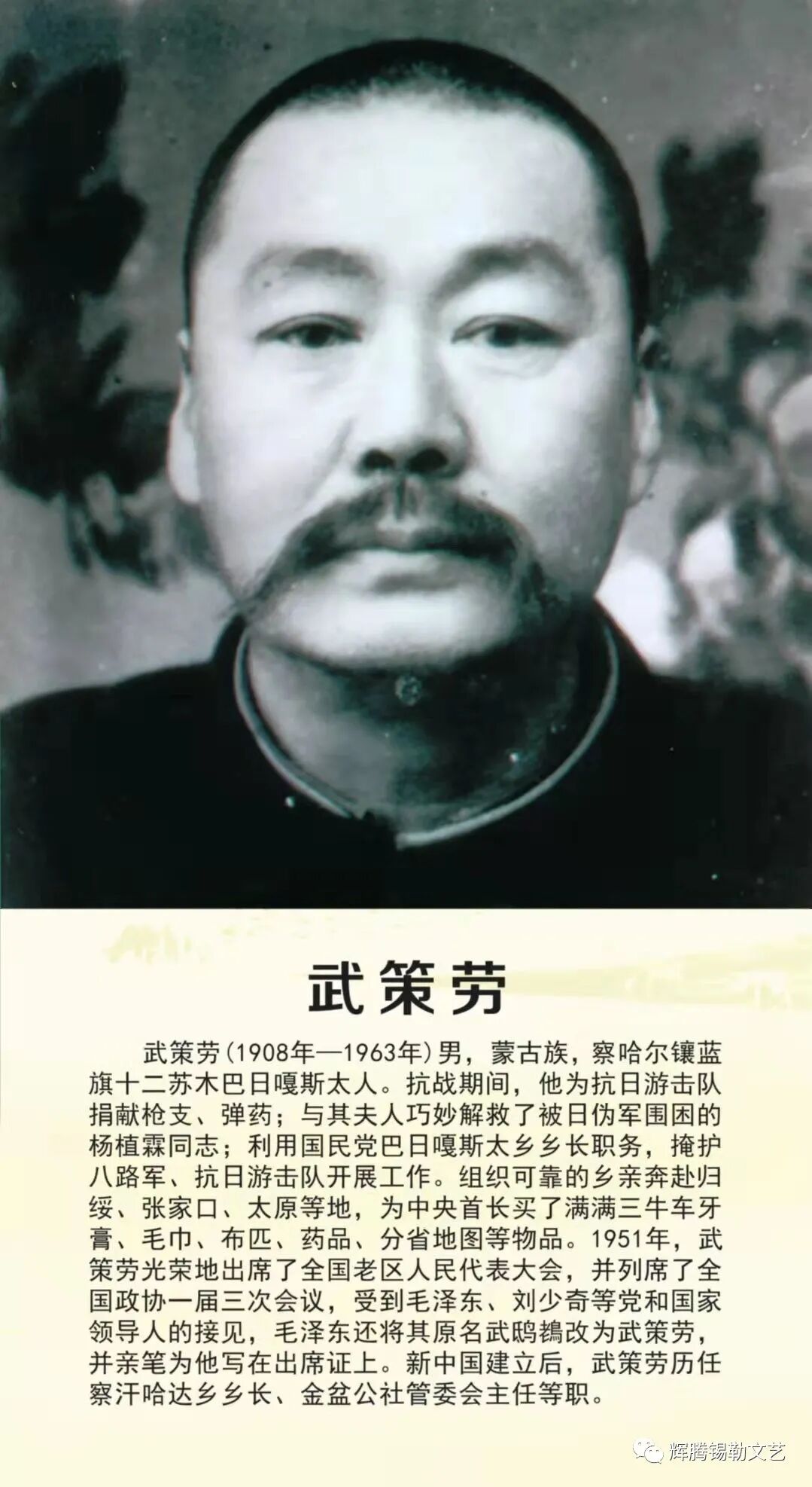 武策劳——赤胆忠心,誓死抗日。武策劳是现察右中旗乌兰哈页苏木巴日嘎斯太人。目睹日寇铁蹄践踏家园,大肆烧杀抢掠的行径,他置生死于度外,于民国27年参加抗日救国会。翌年初,组织动委会人员秘密动员本地蒙古族牧民为抗日游击队捐献枪支弹药,充实抗日武装力量。这年夏天,中共地下党组织通过关系,用现大洋为武策劳买到国民党巴日嘎斯太乡乡长一职。武策劳以此公开身份从事各种秘密抗日活动。在日伪军特务侦探、疯狂搜捕、大肆屠杀抗日志士的白色恐怖下,武策劳建在山顶隐秘处的石窑成了中共绥中地委和中共陶林县委经常工作和活动的地方。